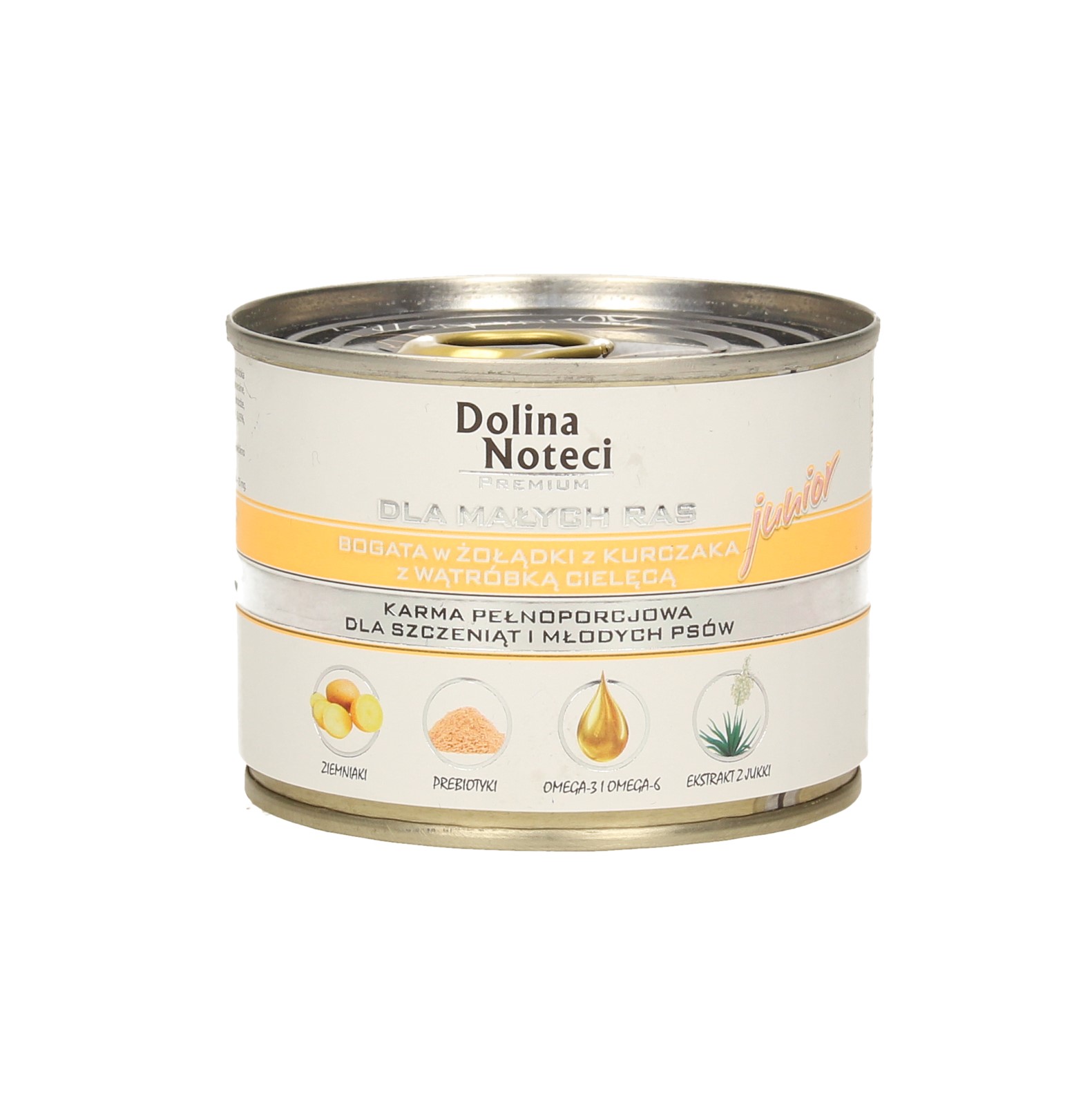 DOLINA NOTECI PREMIUM JUNIOR MAŁE RASY BOGATA W ŻOŁĄDKI Z KURCZAKA Z WĄTRÓBKĄ CIELĘCĄ 185 G