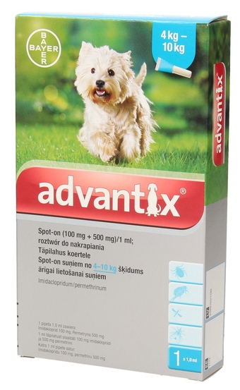 Psy (kg m.c.) >4 do 10 kg| |Rodzaj opakowania Advantix Spot-on dla psów o masie ciała powyżej 4 i do 10 kg| |Objętość (ml) 1,0 ml| |Imidakloprid (mg/kg m.c.) |10 – 25| |Permetryna (mg/kg m.c.) 50 – 125| |Jednorazowe zastosowanie zapobiega dalszej infestacji kleszczy i pcheł przez cztery tygodnie, przez co ogranicza się ryzyko wystąpienia chorób przez nie przenoszonych. Ponowna infestacja związana z pojawieniem się w otoczeniu zwierzęcia nowych pcheł może trwać przez sześć tygodni lub dłużej po rozpoczęciu leczenia. W takim przypadku może być konieczne więcej, niż jednorazowe użycie preparatu, w zależności od ilości pasożytów w otoczeniu. Aby utrudnić pchłom bytowanie w środowisku, zaleca się stosowanie środków zwalczających dorosłe pchły i osobniki w stadiach rozwojowych w otoczeniu zwierzęcia. Jednorazowe leczenie zapewnia widoczne działanie odstraszające wobec meszek i komarów w ciągu czterech tygodni, zmniejszając przez to ryzyko wystąpienia chorób przez nie przenoszonych. Preparat zachowuje skuteczność po zmoczeniu sierści zwierzęcia. Jednakże w przypadku częstego kontaktu z wodą, konieczne może być ponowne naniesienie preparatu, w zależności od obecności ektopasożytów w otoczeniu zwierzęcia. W takim przypadku nie należy stosować preparatu częściej, niż raz na tydzień W przypadku zaistnienia konieczności umycia psa szamponem, zaleca się uczynić to przed naniesieniem preparatu lub przynajmniej w tydzień po jego zastosowaniu, w celu uniknięcia konieczności powtarzania zabiegu.